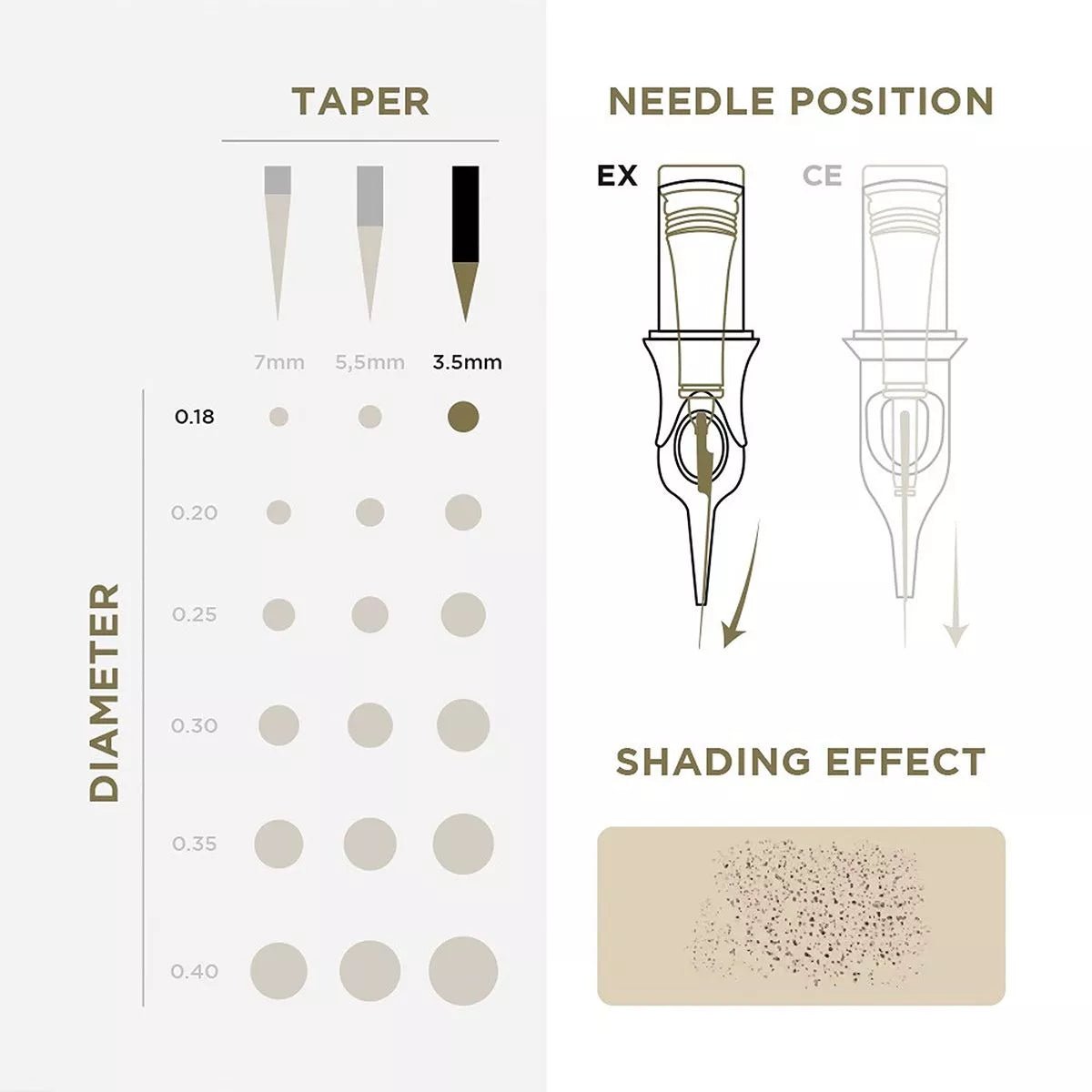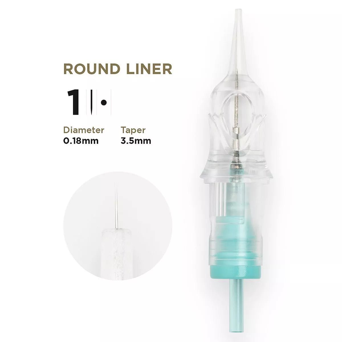 Punta 1R: Adatta per i dettagli più fini nei tatuaggi e nel trucco permanente. Fornisce una precisione ottimale per motivi complessi, tratti di capelli e dettagli dell'eyeliner nei procedimenti di PMU.